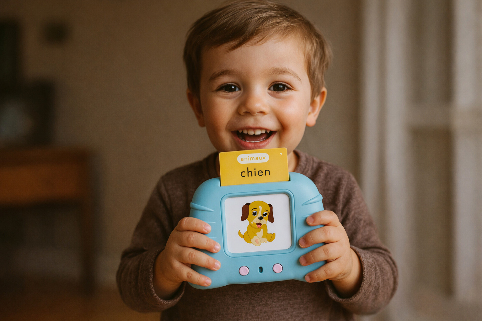 La plupart des jouets amusent quelques minutes, mais celui-ci aide réellement votre enfant à apprendre à parler. Chaque carte déclenche un mot clair, une image et une répétition naturelle, transformant le jeu en véritable développement du langage — sans écran, en toute autonomie.